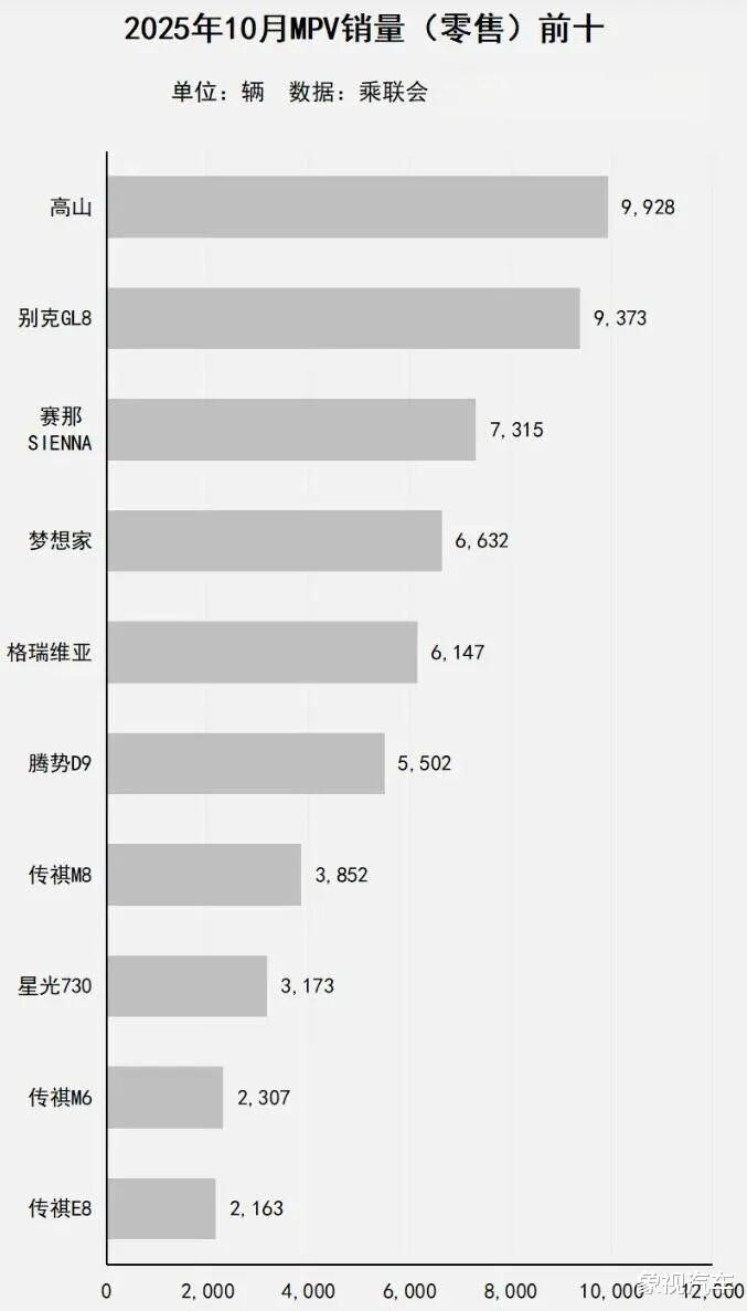 高山10月销量接近万辆,达到了9928辆,以555辆的优势将别克GL8踩在脚下,成为当月最畅销的MPV。