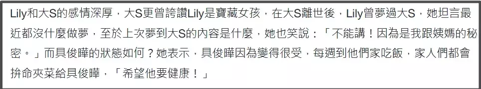 最近S家和汪小菲一家又隔空对上了!小S二女儿Lily现身参加活动,采访时挨个提及家人,从妈妈小S聊到姐姐Elly,更不忘透露姨父具俊晔近况,自曝具俊晔每周都去她家吃饭。