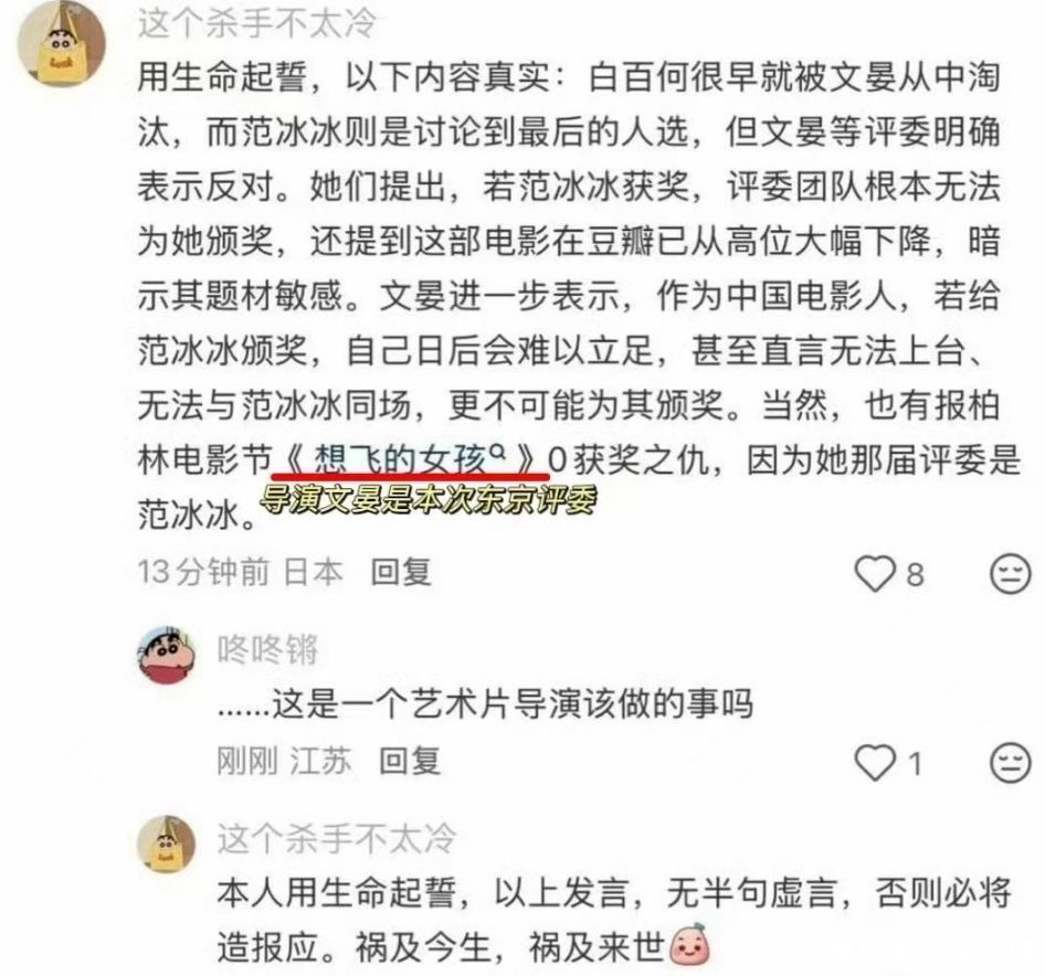 那么评委为什么要针对中国女演员而去捧有争议的王传君?有网友称评委文晏和范冰冰本就有矛盾,而且自己不想不能和范冰冰同台。