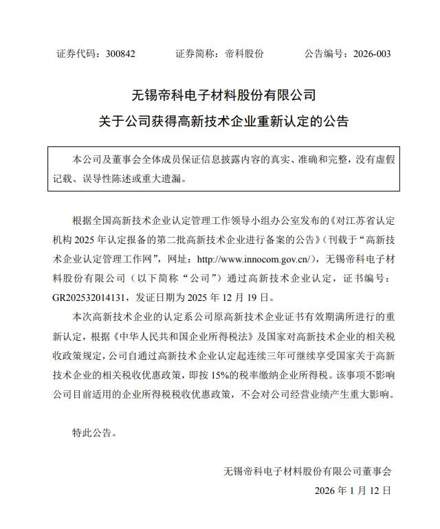 1月12日,帝科股份(300842)发布关于公司获得高新技术企业重新认定的公告。