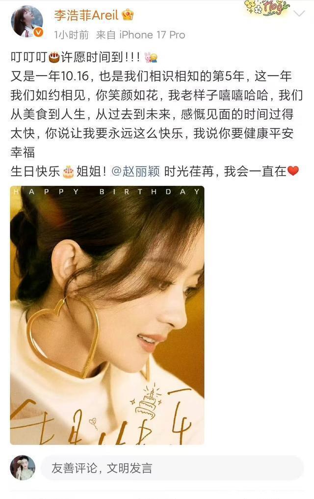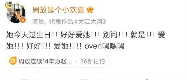 在赵丽颖生日这天点过后没多久,周放便发文为赵丽颖庆生,这是她连续14年为赵丽颖公开庆生。 她晒出了两人过去的一张合照,并配文“她今天过生日!好好爱她!别问!就是!爱她!”。